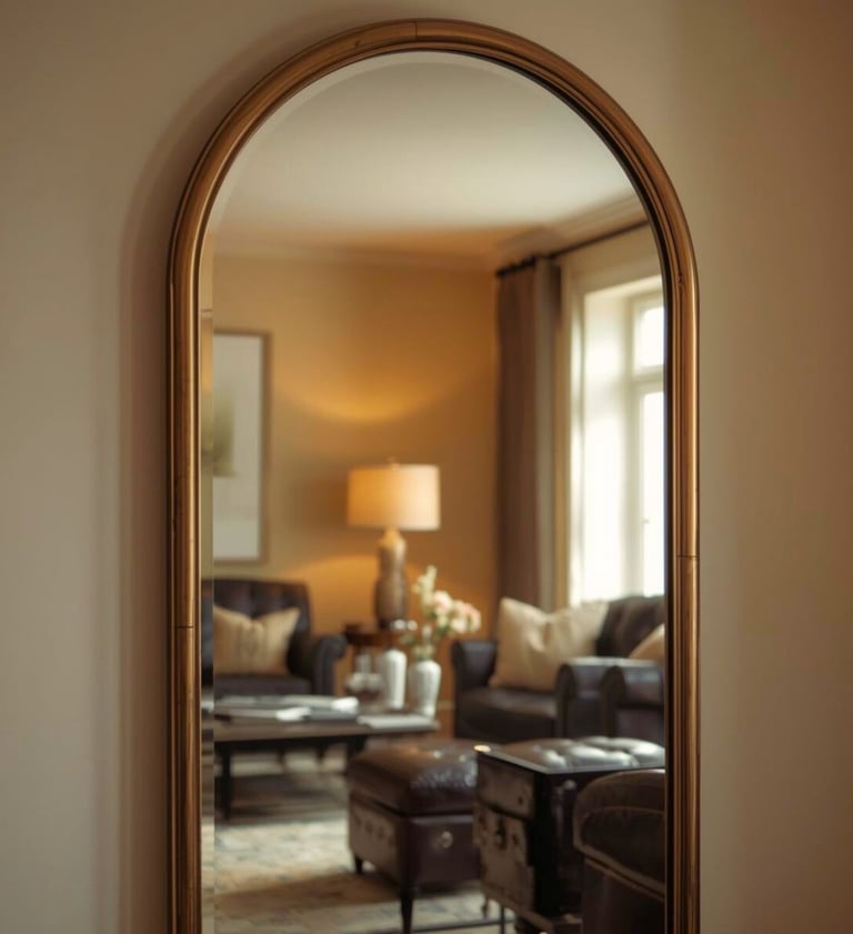 An arched metal mirror with an aged finish adds subtle elegance while enhancing light and depth in boho living rooms.