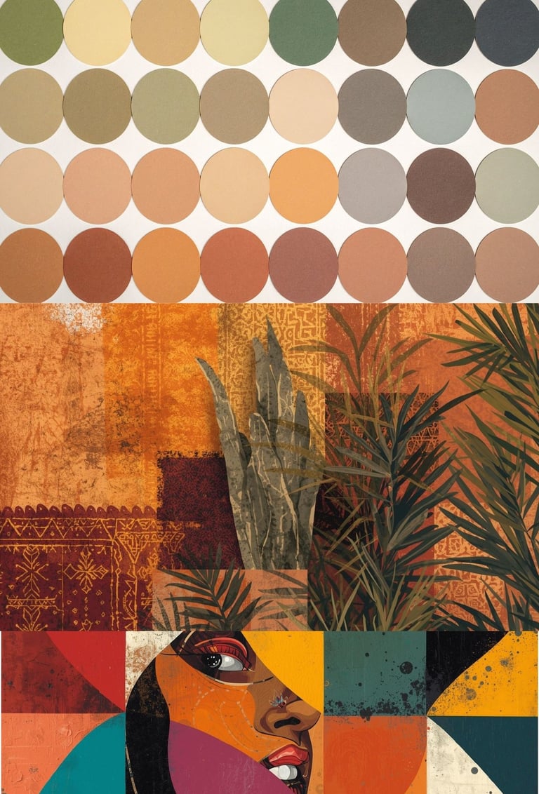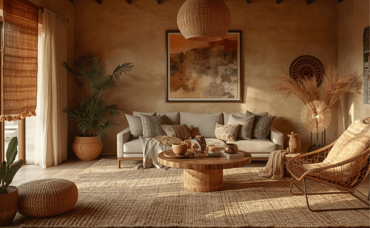 Instead of bright whites or cool grays, Afro Bohemian interiors lean toward natural, sun-warmed shades. Layering these tones allows the room to feel cohesive without looking flat, especially when paired with textured fabrics and organic materials.
