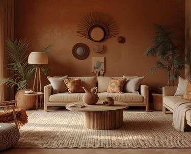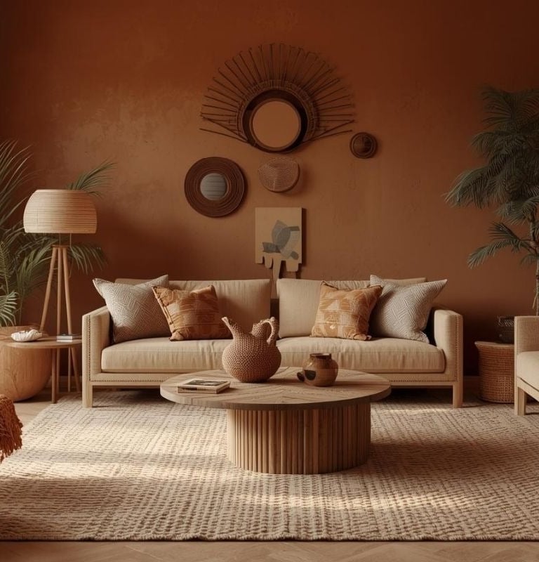 Color plays a powerful role in Afro Bohemian living rooms. Earthy tones like terracotta, clay, warm browns, and deep neutrals create a grounded foundation, while bold accents inspired by African landscapes add depth and emotion. These colors work together to create a space that feels warm, expressive, and inviting.