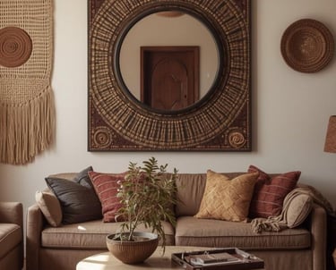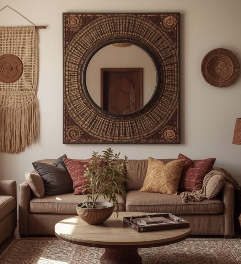To reflect light and enhance handmade details, a mirror is essential, and this natural-style mirror on Amazon fits perfectly with Afro Bohemian interiors.
