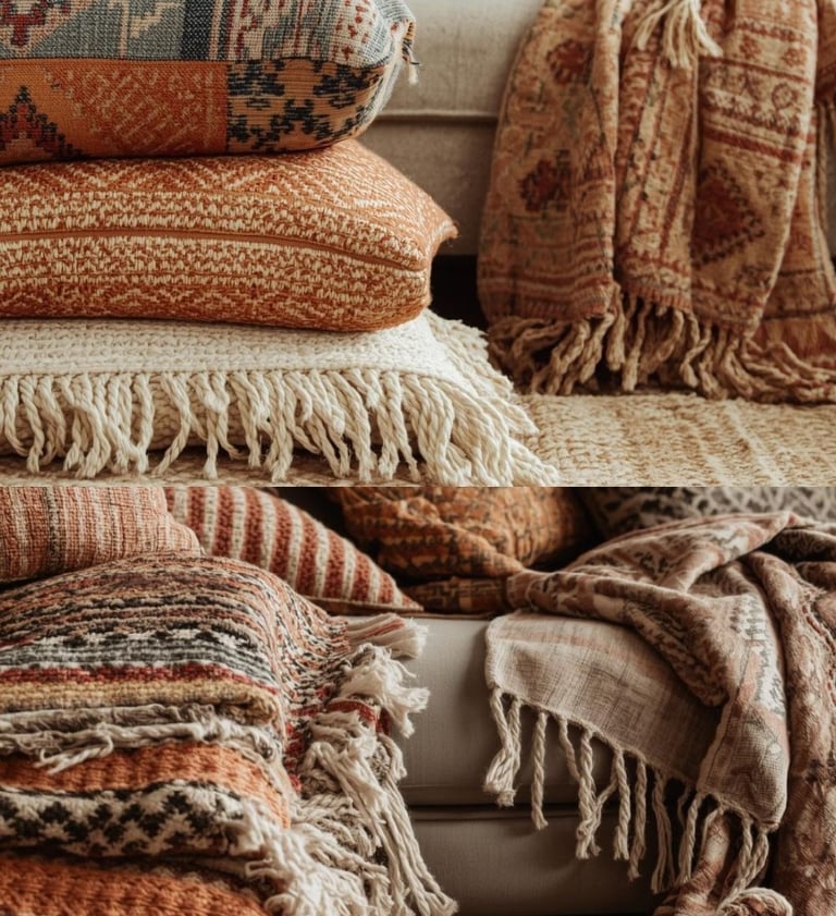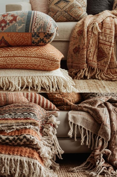 Afro Bohemian textiles with patterned cushions, textured throws, and warm layered fabrics