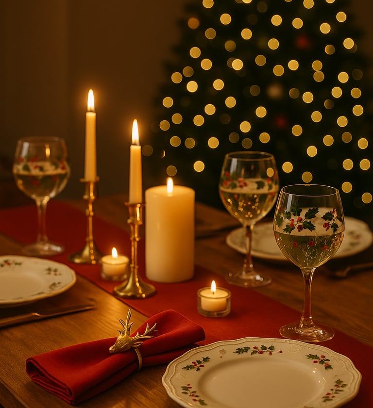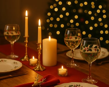 vintage ivory dinnerware with red-green holly accents; red napkins with gold reindeer rings ,holly-patterned wine glasses,and a beautiful ivory-and-gold Nativity set, this table brings classic Christmas charm to life. Soft candlelight from brass candlesticks with gold taper candles creates a magical glow, while a softly blurred Christmas tree in the background adds the perfect festive touch. Whether you're decorating for Christmas dinner, a holiday party, or a cozy family night, this warm vintage look is full of inspiration for your next celebration.