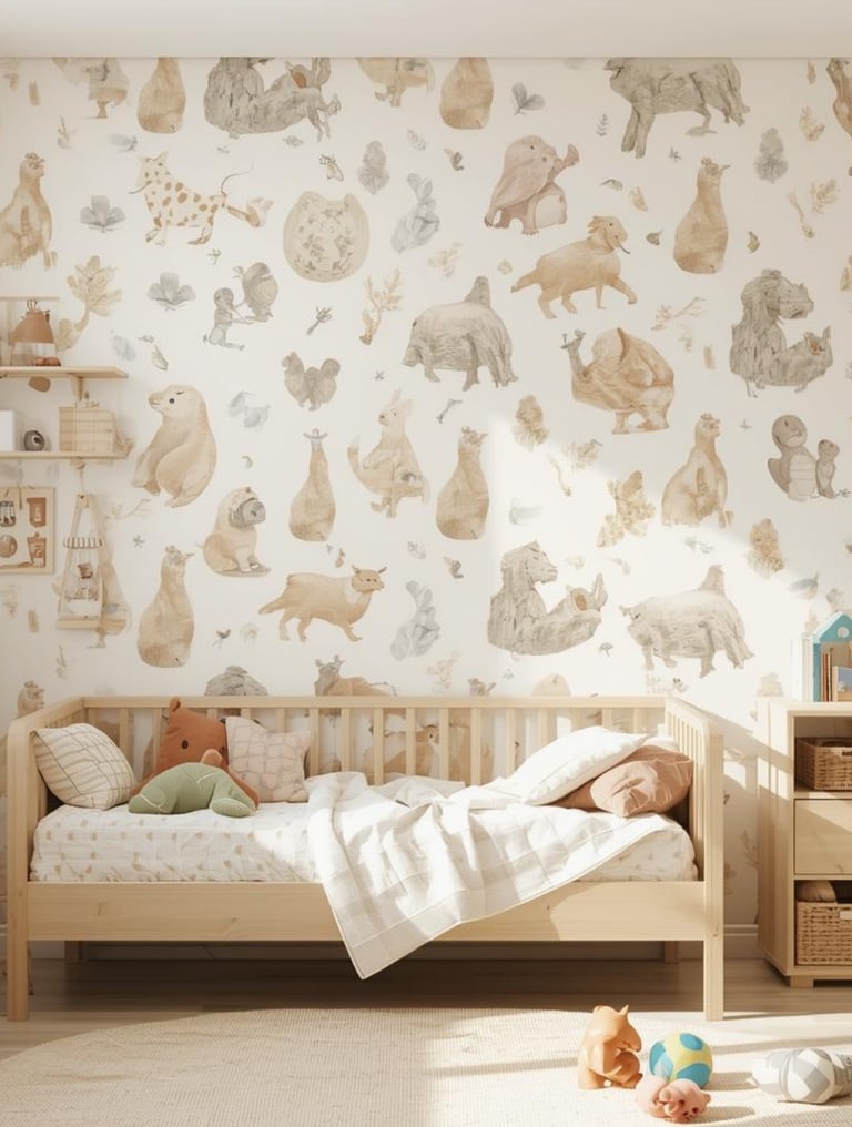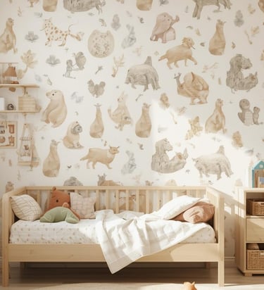 Wallpaper in kids’ rooms should feel playful yet flexible enough to grow with the child. Rather than bold, overly themed designs, softer patterns and warm colors create a space that feels cheerful without becoming overwhelming over time. Nature-inspired illustrations, gentle shapes, and subtle textures work well for creating a calm and friendly environment.
