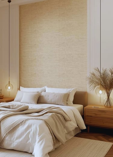 Muted florals, fabric-inspired textures, and warm neutral tones work especially well behind the bed as an accent wall. These designs add depth to the room without overwhelming it, allowing bedding, cushions, and lighting to stand out naturally. When combined with natural materials such as wood furniture, linen textiles, and soft ambient lighting, wallpaper helps create a bedroom that feels both cozy and timeless.