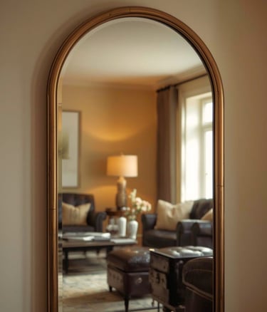 An arched metal mirror with an aged finish adds subtle elegance while enhancing light and depth in boho living rooms.