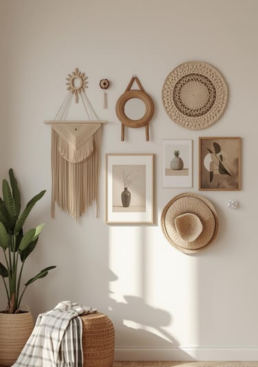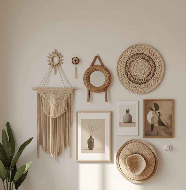 Boho wall decor ideas featuring woven art, handmade textures, and eclectic patterns