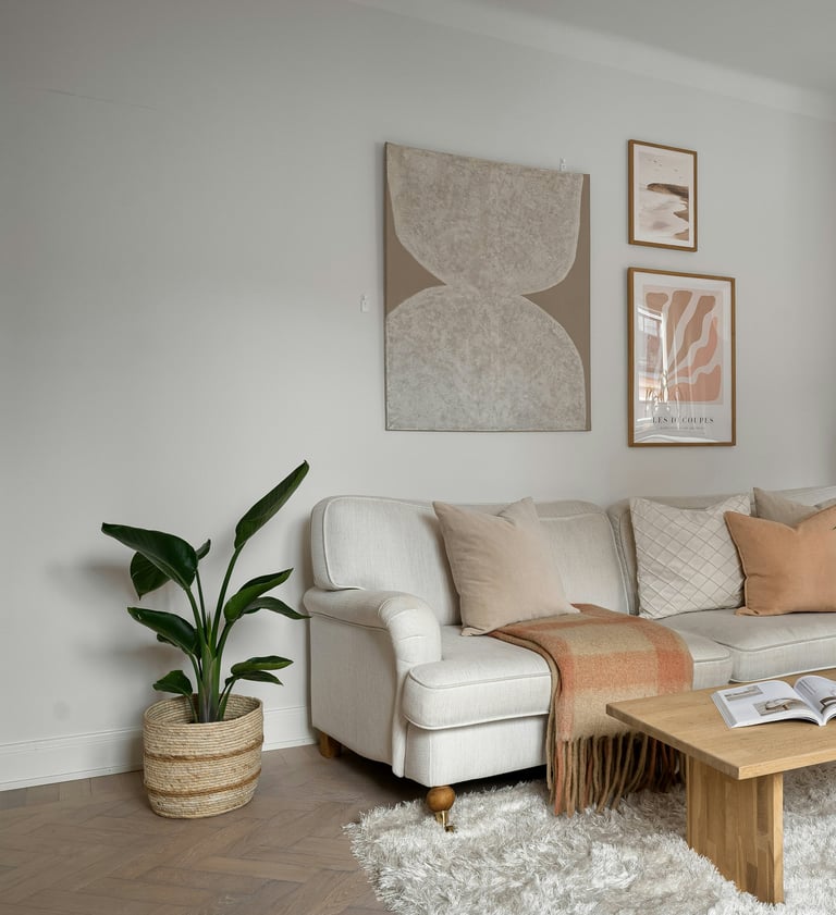Adds visual softness and balance while warming the space with organic shapes and neutral tones.